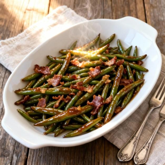 - Toss the green beans with the glaze and bacon. Make sure everyone’s coated. This isn’t a light-interaction situation—it’s a full-blown flavor bath.