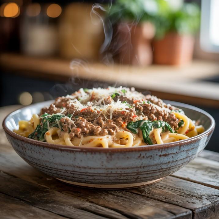 Toss the pasta straight into your beefy creamy pan, along with the spinach so it wilts nicely. Stir everything together until it looks like something Instagram-worthy but way more edible in real life.
